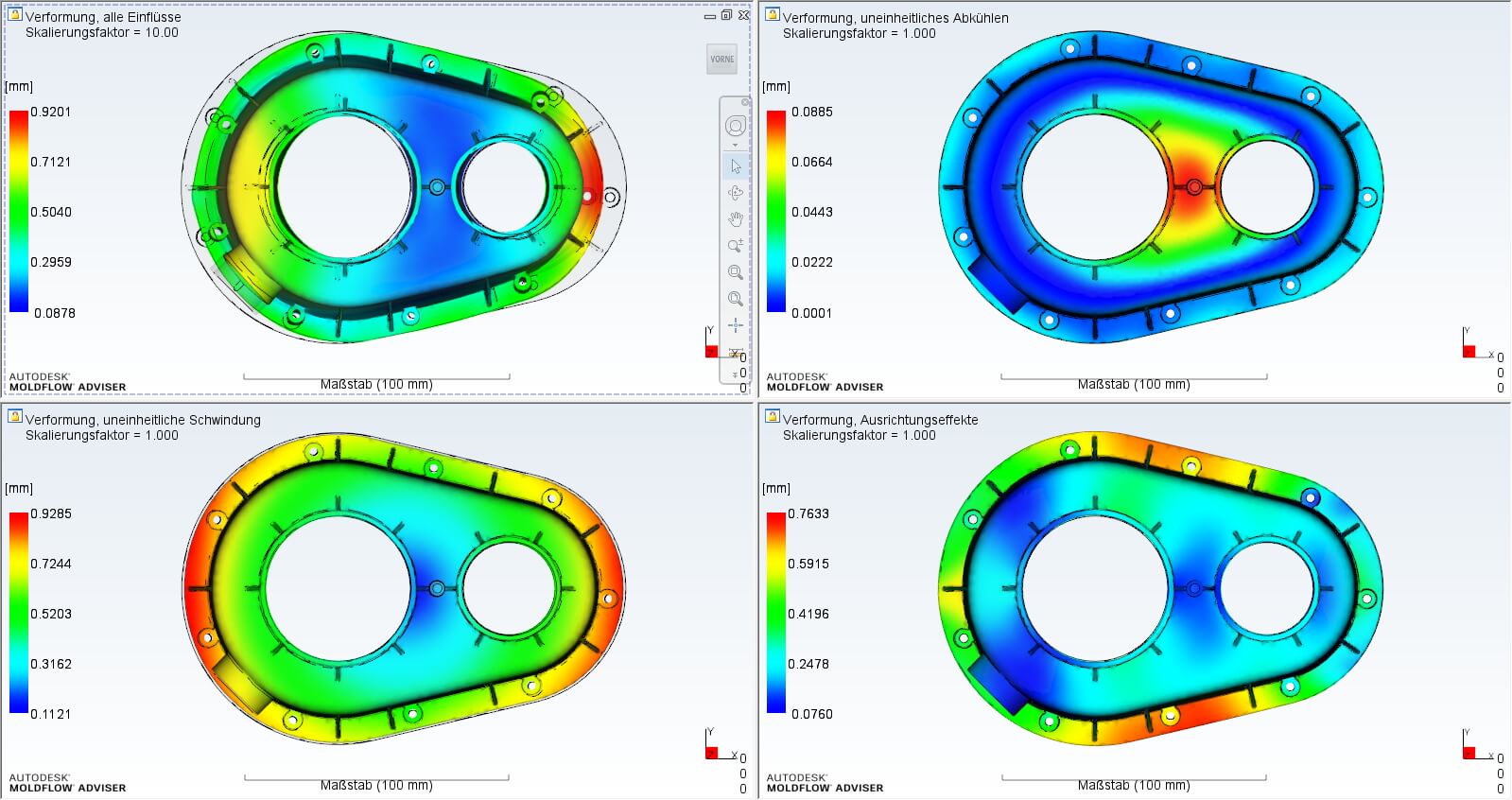 Im Gegensatz zu Autodesk Moldflow Insight ist der Adviser auf die konstruktionsbegleitende Simulation ausgelegt. Die Verwendung des Autodesk Moldflow Adviser ist besonders einfach und intuitiv und unterstützt den Konstrukteur mit wesentlichen Informationen zur Füllung, der Schwindung, dem Verzug usw. und lässt den Konstrukteur so bereits in der sehr frühen Produktentwicklungsphase die Konstruktion beurteilen und entsprechend auslegen.